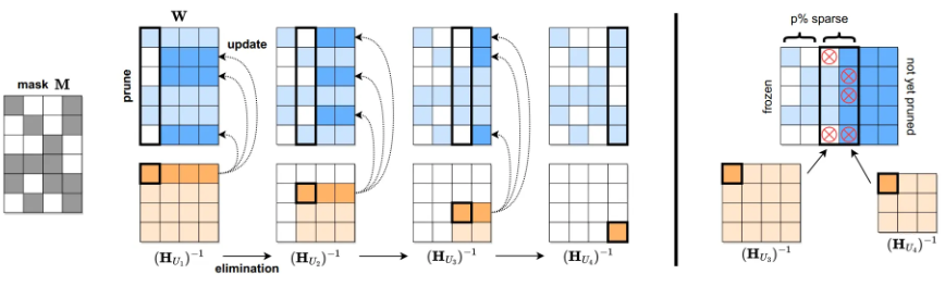 SparseGPT:它使用最小化重构损失的方法来移除冗余的参数,从而大幅减少模型的规模。SparseGPT基于Optimal Brain Surgeon(OBS)算法,通过分析剪枝对网络重构损失的影响来生成剪枝掩码,并调整剩余的权重以补偿剪枝带来的误差。这一过程非常高效,避免了反复训练。SparseGPT还采用了局部层级剪枝方式,这使得剪枝过程能够并行化,并通过近似二次损失避免了计算海森矩阵的高昂成本。