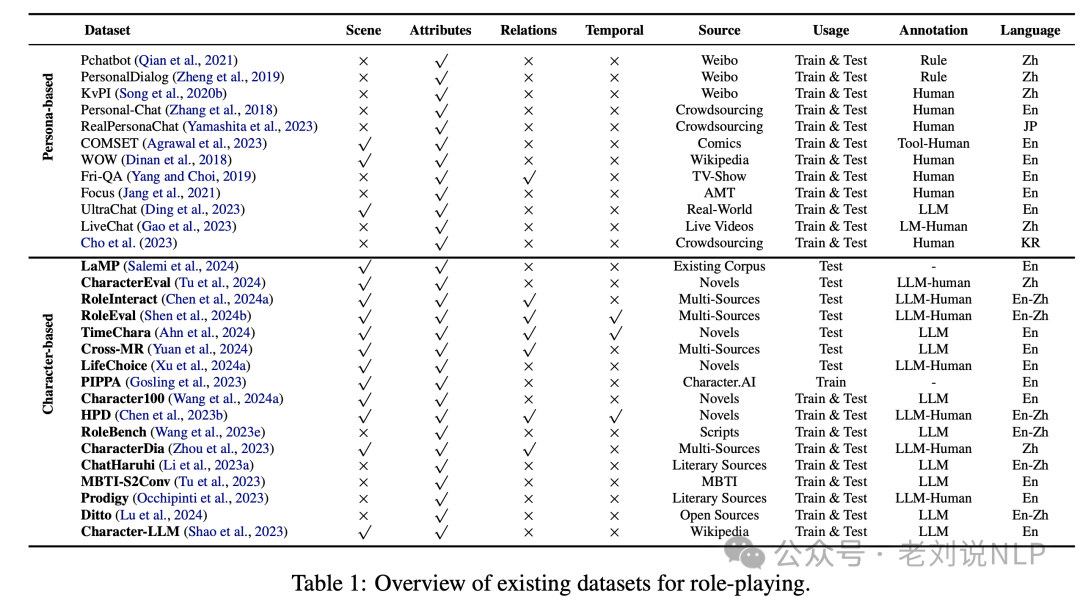 最近出来一个系统性的整理工作,Awesome-Role-Play-Papers (beta) - Your Guide to Role-Playing with Language Models,对应论文是《The Oscars of AI Theater: A Survey on Role-Playing with Language Models》(https://arxiv.org/abs/2407.11484)