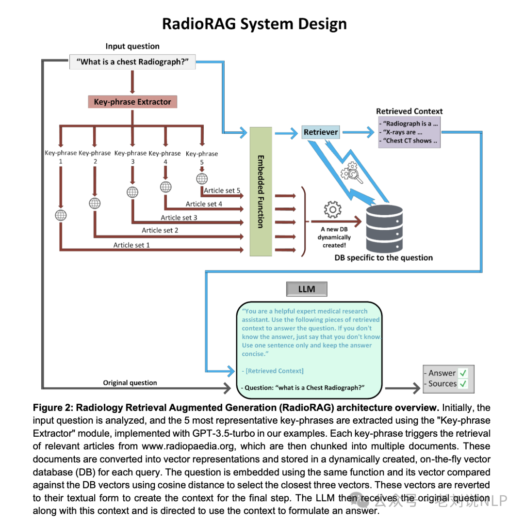 Online Context and Database(在线上下文和数据库):根据提取的关键词,在www.radiopaedia.org上搜索相关文章,选择与每个关键词最相关的五篇文章。将这些文章分割成1000个标记的块,每个块有200个标记的重叠,并将每个块转换为向量。
