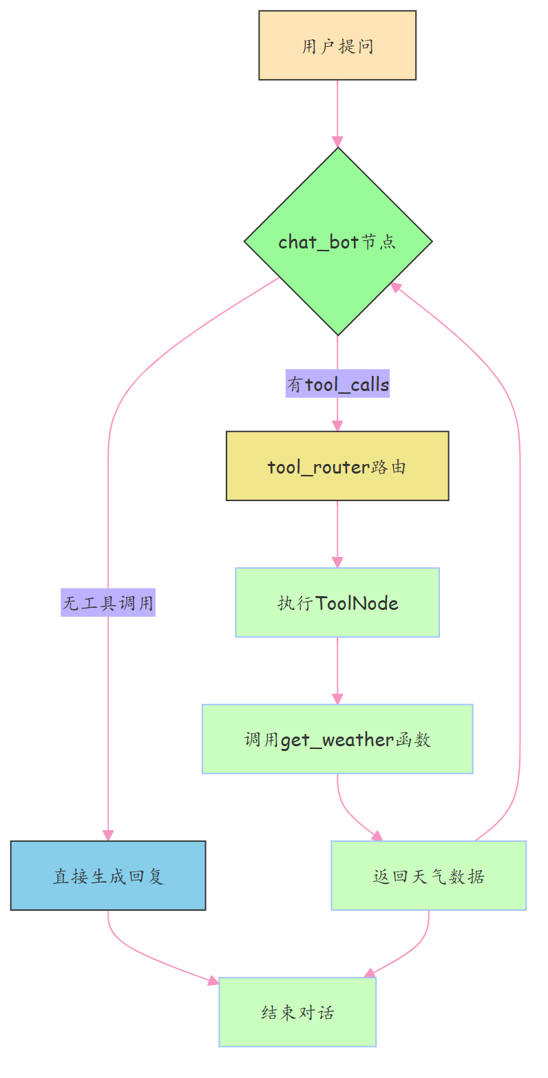 - 边(Edges):每 一 边是Python函数,根据当前状态决定下一步去哪,支持条件判断和循环。