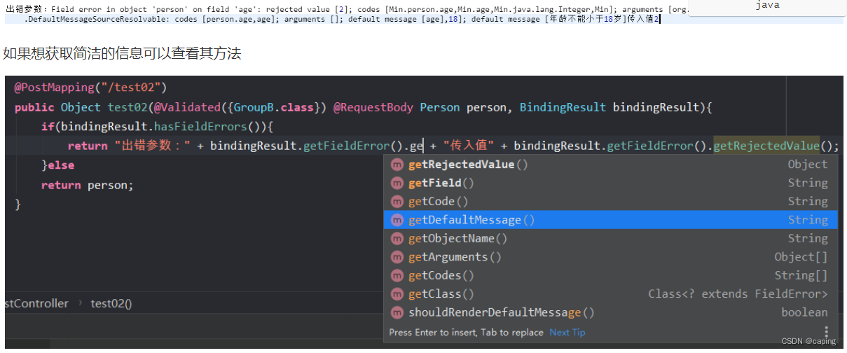 return "出错参数:" + bindingResult.getFieldError() + "传入值" + bindingResult.getFieldError().getRejectedValue();