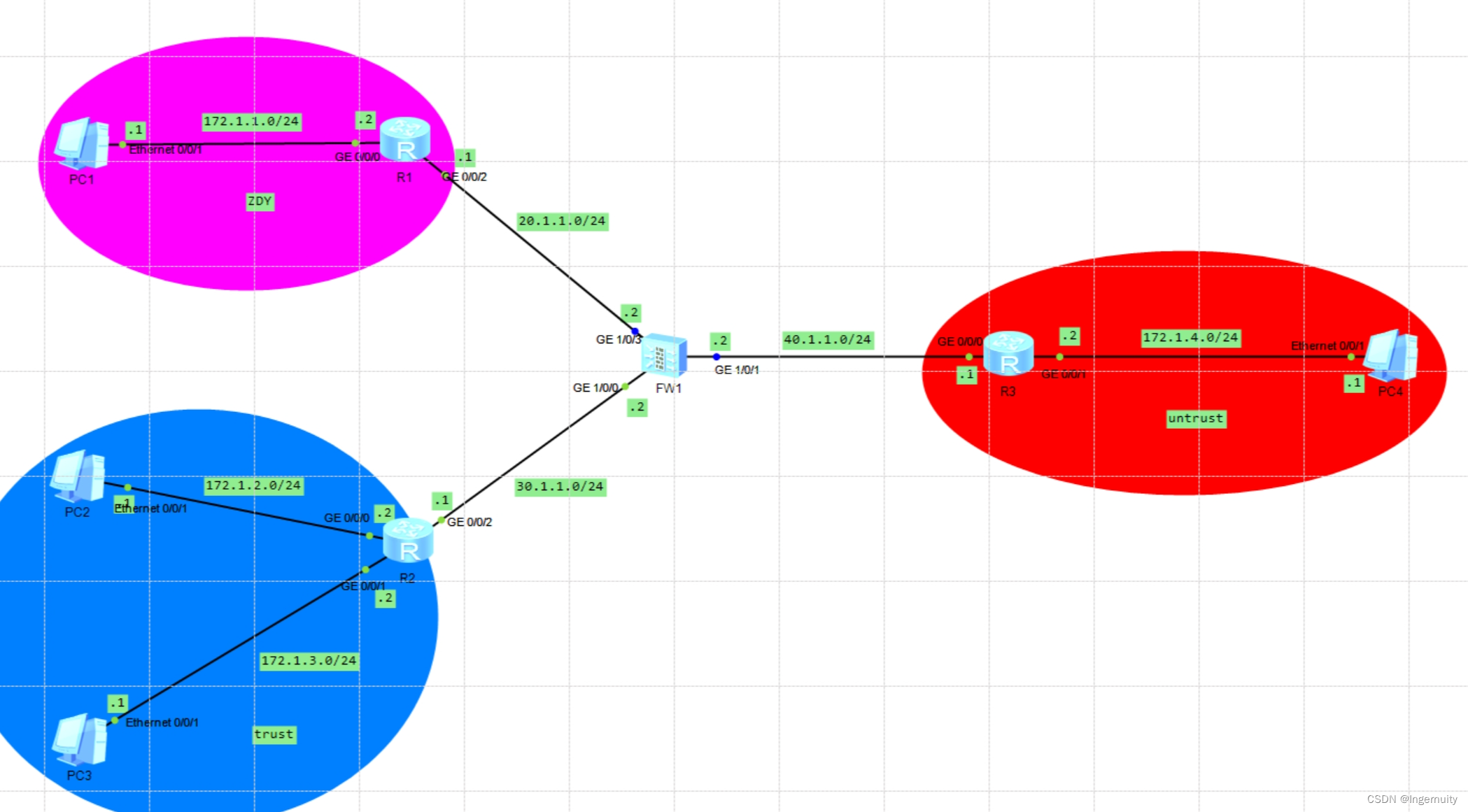 华为防火墙跨区域互通、私有地址nat转换 (3)4.全网运行ospf,确保Pc可以ping通对应区域的防火墙接口,如Pc3需要ping通防火墙的G1/0/1接口,PC2需要ping防火墙的。(4)部署安全策略,要求实现PC2可以ping通PC4、PC2可以ping通Pc3(默认可通)、PC3可以ping通Pc1,其他均不可通。(2)按照题目要求设备安全区域,其中ZDY为自定义区域,优先级为30,并将相应的防火墙接口划分进对应区域。默认情况下,各区域是互相隔离的,需要配置对应的安全策略,来放行各区域的流量,以实现不同区域的互访。