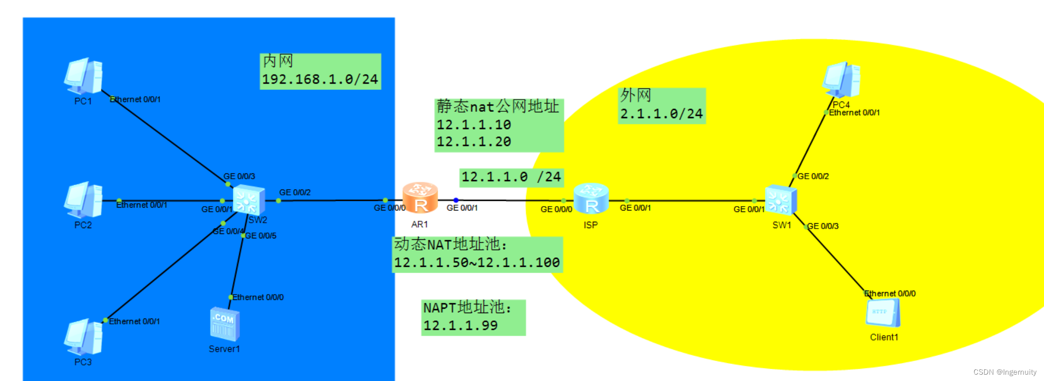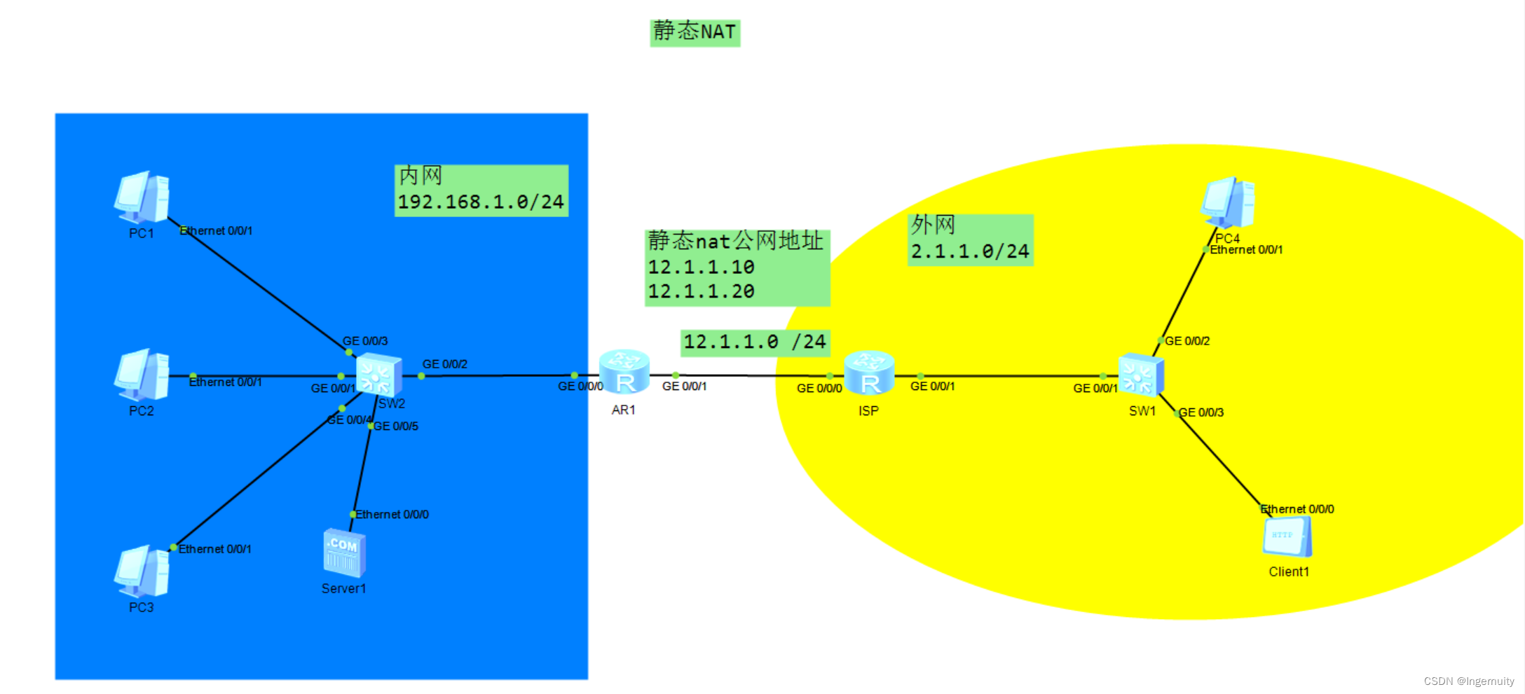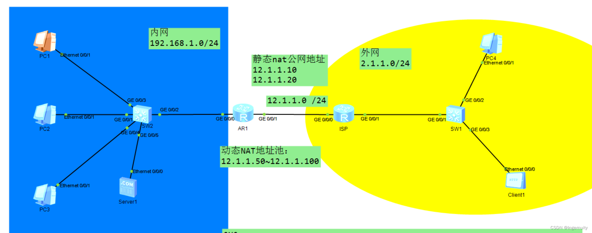 静态NAT 哈喽!各位小伙伴们好久不见,最近由于工作的原因断更了一段时间,不过最近我都会把这些给补上,今天我们来学习一个简单的知识——静态NAT转换。第一章 什么是NAT技术?网络地址转换技术NAT(Network ADDress Translation)主要用于实现位于内部网络的主机访问外部网路的功能。当局域网内的主机需要访问外部网络时,通过NAT技术可以将其私网地址转换为公网地址,并且多个私网用户可以共用一个公网地址,这样既可以保证网络互通,又节省了公网地址。1.2 N