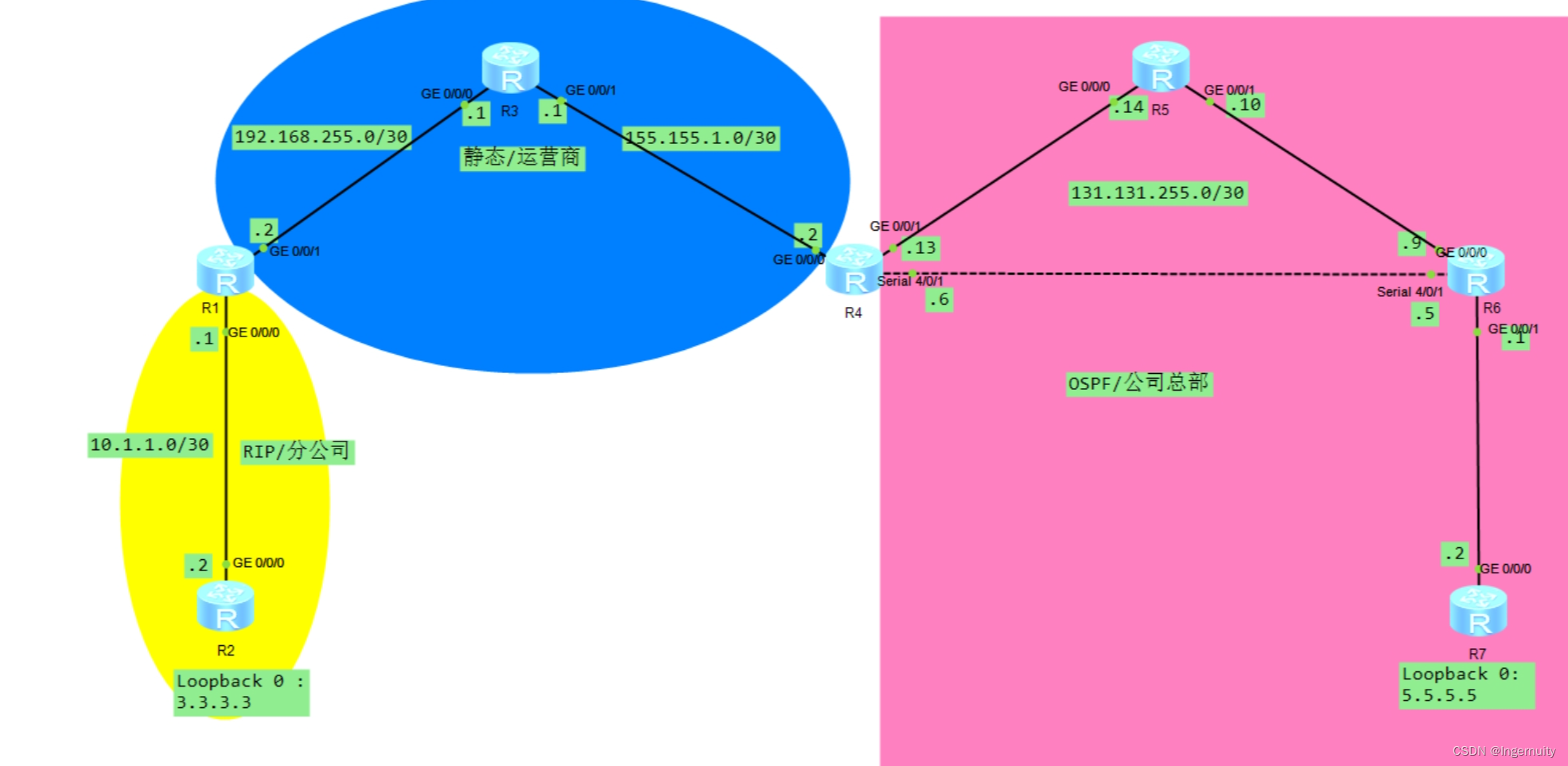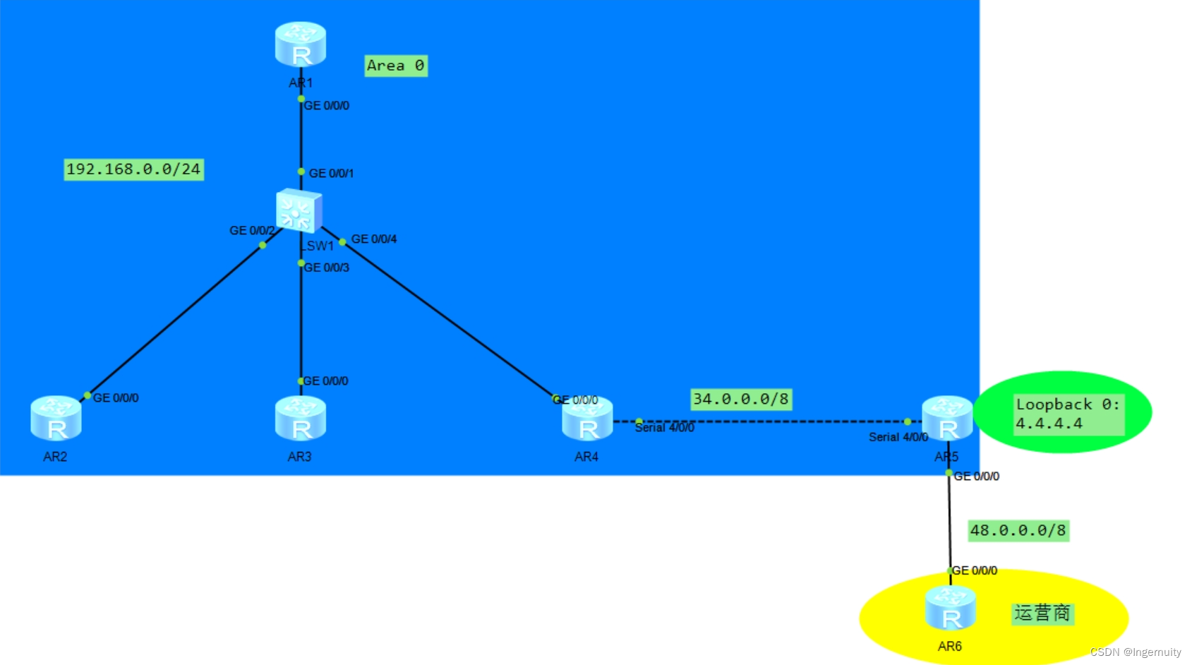 OSPF基础+OSPF缺省路由发布+OSPF认证实验 为了适应大型网络,OSPF在AS内划分多个区域,区域是以接口为单位来划分,每个OSPF路由器只维护所在区域的完整链路状态信息只要是多路访问BMA和NBMA网络中,为了减少邻接关系的数量,从而减少数据包的交换次数,最终节省带宽,降低路由器的处理压力,选举DR和BD。