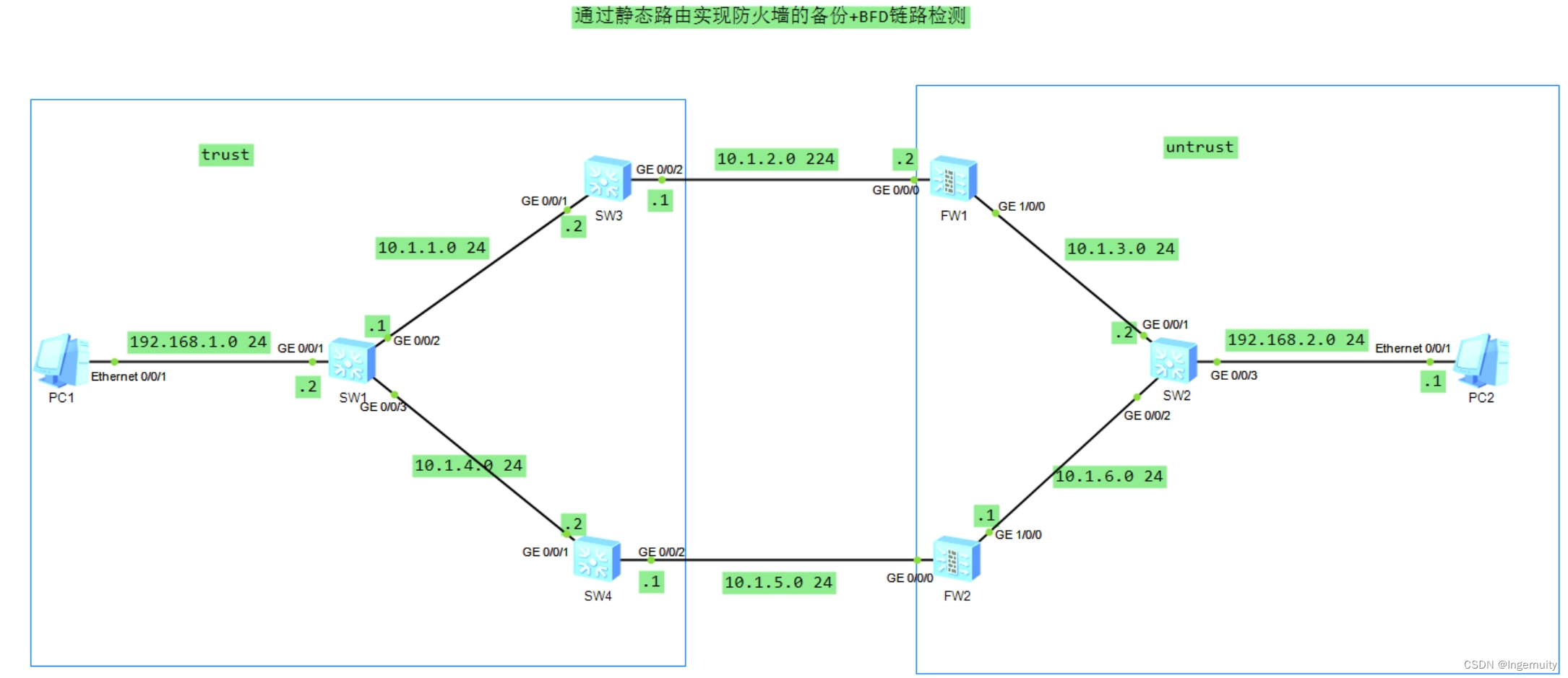通过静态路由实现防火墙备份+NQA链路检测 发现reply回复报文走的使SW2的上行链路,而SW1的上行链路被咱们阻塞掉了,它的回复报文并没有从下行链路走,所以导致SW1的上行链路阻塞掉之后ping不通PC2。down掉之后PC1ping不通PC2了,正常应该是走下面的备份链路,这是为什么呢?通过测试发现PC1的报文链路走的是下行链路,SW2走的也是下行链路。我们首先来查看SW1的路由表,看它是否切换到了备份链路。今天手把手教你如何实现,保姆及教程,小白也能看得懂!当我们把SW2的上行链路也down掉之后发现,又通了。