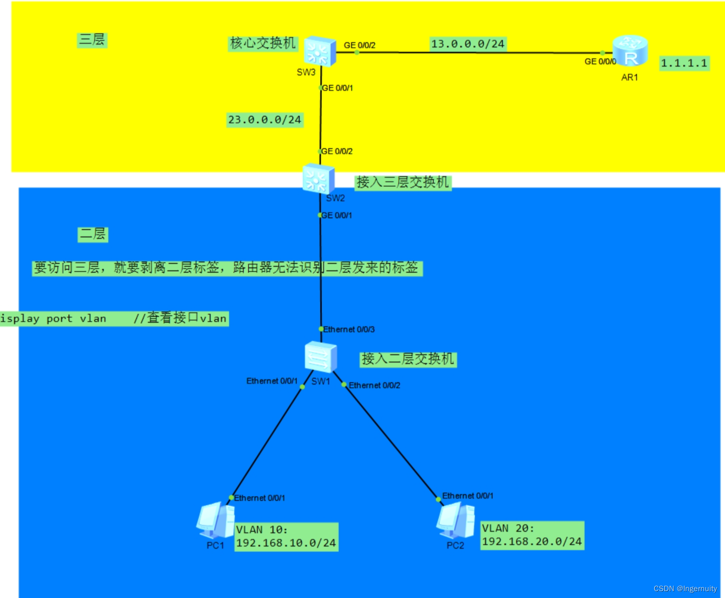 保姆级教程——VLAN综合实验(不同VLAN通过动态路由访问外网) 通过PC1和PC2访问到外网。部署了VLAN的传统交换机不能实现不同VLAN间的二层报文转发,因此必须引入。VLAN路由可以通过二层交换机配合路由器来实现,也可以通过三层交换机来实现。,因此属于不同VLAN的节点之间是无法直接互访的。不同VLAN间的通信。,不同的VLAN之间。