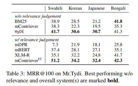 - 所有语言任务中,HyDE 均优于无监督 mContriever 和 BM25;