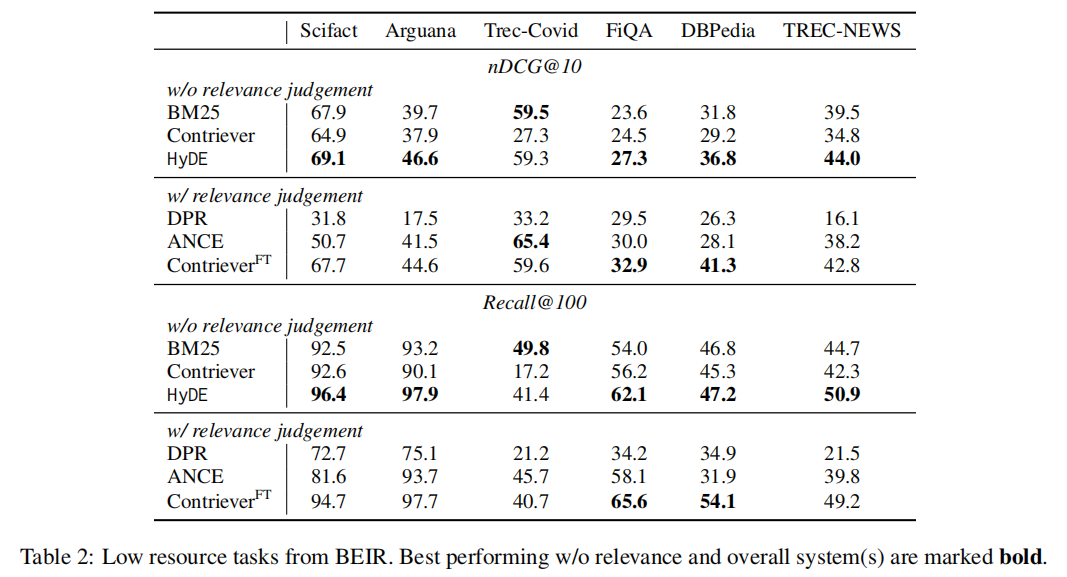 在 BEIR 数据集的 6 个低资源任务中(如 SciFact 事实验证、FiQA 金融问答),HyDE 的优势进一步放大: