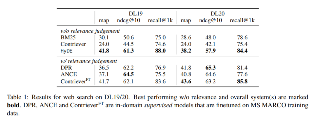 在 TREC DL19/20 数据集(基于 MS-MARCO,主流网页搜索评测基准)上,HyDE 大幅超越无监督基线,甚至接近有监督微调模型: