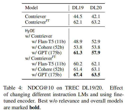 - 微调编码器兼容:即使将 HyDE 与微调后的编码器结合,InstructGPT 仍能进一步提升性能(如 DL19 数据集 NDCG@10 达 67.4,超过 ContrieverFT 的 62.1),说明生成模型能捕捉微调编码器未覆盖的语义信息。