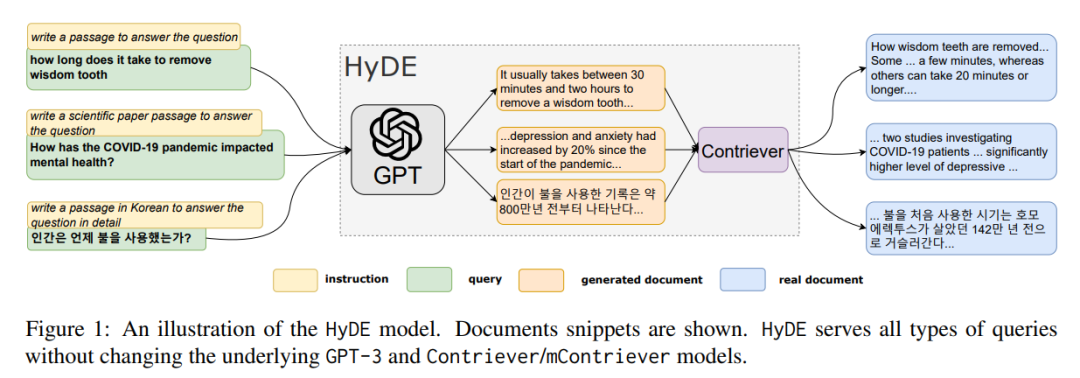 给指令跟随型大模型(如 InstructGPT)输入用户的短查询,再搭配特定指令(如“撰写一段回答该问题的内容”),让模型生成一份“假设文档”。这份文档不需要完全真实(允许包含虚假细节),但必须能覆盖查询的核心意图、捕捉“相关文档应具备的语义模式”——比如查询“智齿拔除需要多久”,生成的假设文档会包含“拔除时间受牙齿位置、复杂程度影响,简单情况几分钟,复杂情况需20分钟以上”等信息,这些信息正是真实相关文档会涵盖的核心内容。