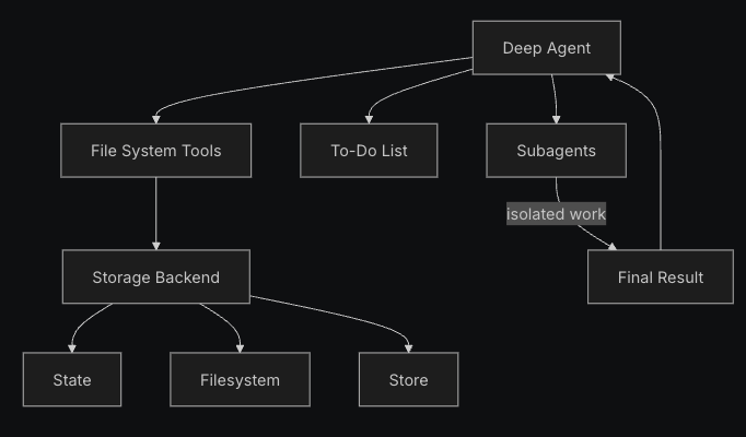 DeepAgents 内部的通信机制基于状态共享和消息传递。主智能体负责任务分解和分配,子智能体专注于执行特定任务,并将结果写回共享状态。