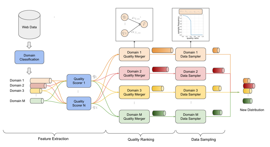 方法首先为数据计算多个质量指标,例如语言流畅性、复杂度、干净度等;同时通过领域分类确定其所属领域。然后构建一个依赖“质量向量 + 领域标签”的采样函数,对每条数据分配采样概率。该函数的参数通过轻量实验优化,最终用于完整预训练过程。