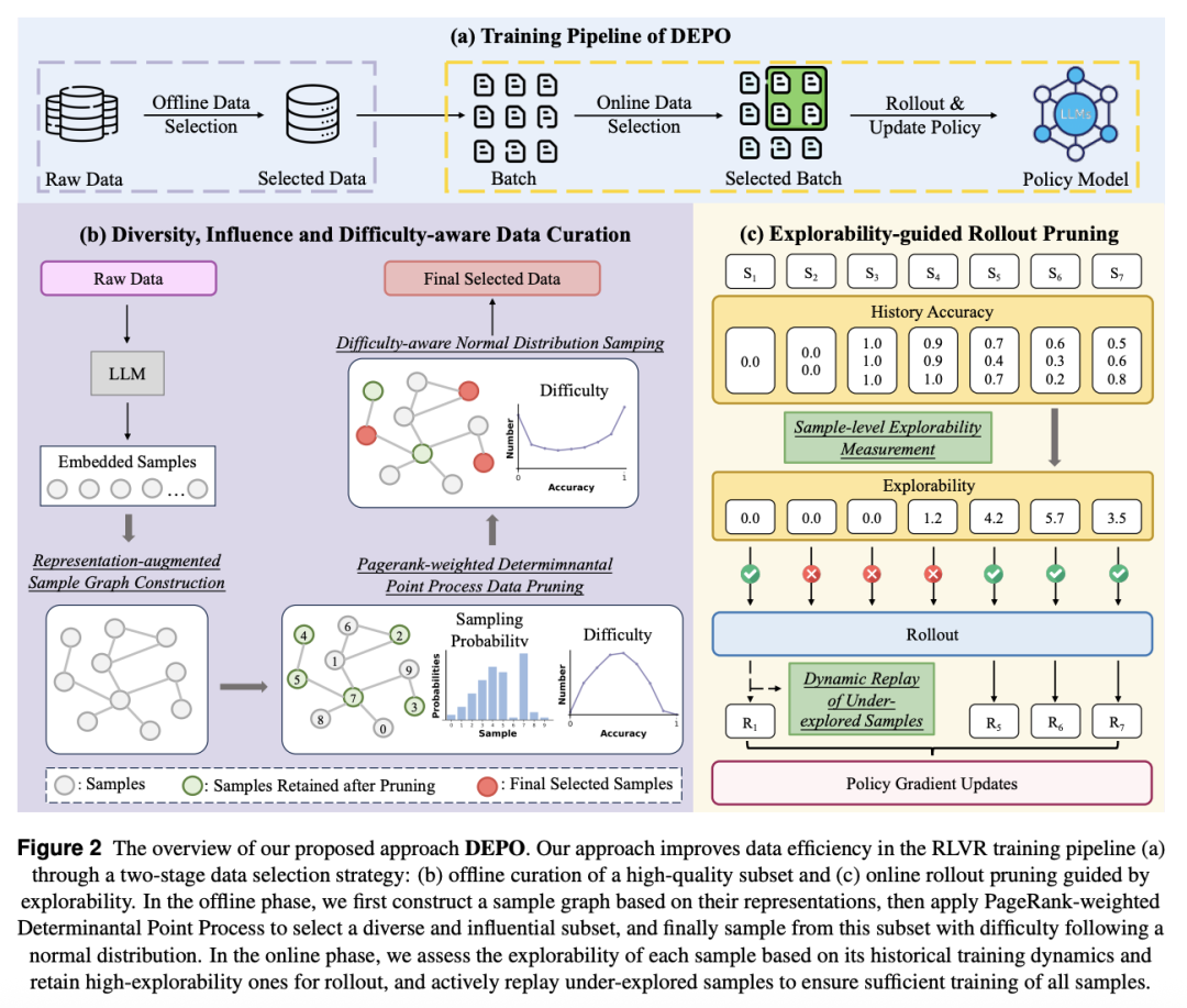 现有 RLVR 方法、通过扩大训练数据量和 rollout 数量来提升模型推理能力,但这导致训练成本激增(计算资源、时间)且数据利用率低。