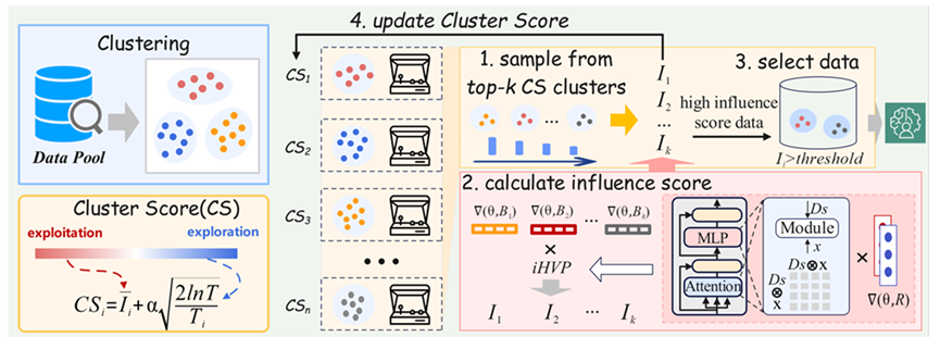 Quad 首先通过高效的反向 Hessian 计算方法,为每条数据估计其对模型的影响力。然后将整个语料按语义表示聚类成多个簇,每个簇被视为多臂赌博机问题中的一个“臂”。在选择训练数据时,算法不仅根据影响力选取强数据,也刻意探索那些被选得较少、但有潜在价值的簇,以保证整体的多样性。
