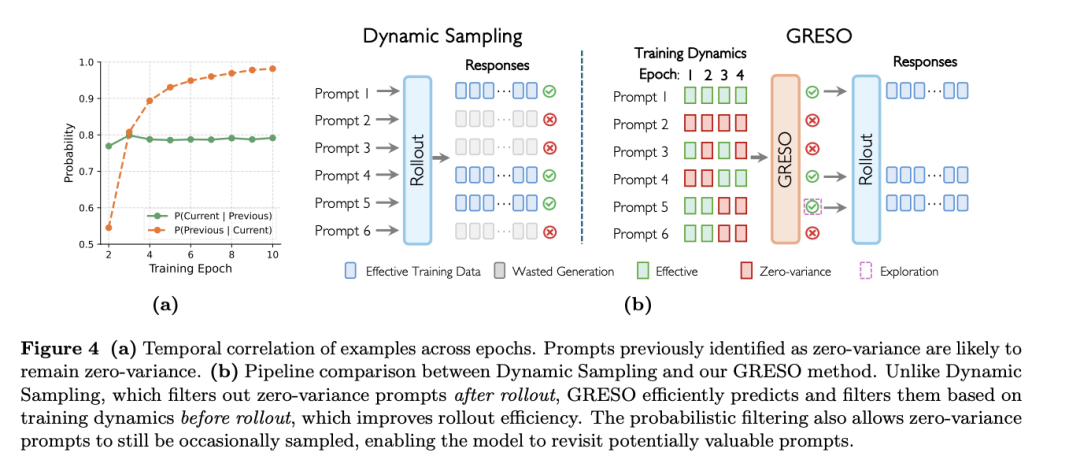 论文分析了提示在不同训练epoch中的奖励动态,发现零方差提示(即所有响应的奖励都相同的提示)在训练过程中具有很强的时间一致性。
