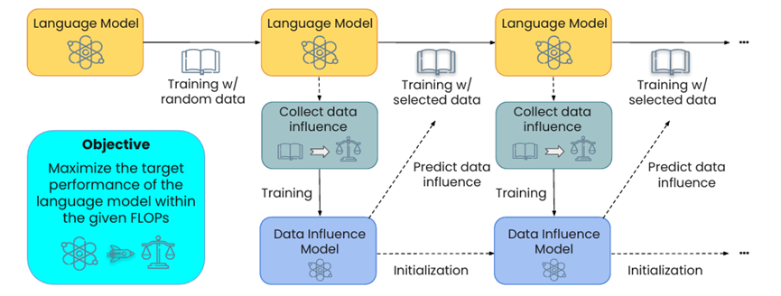 其核心是构建一个“数据影响力模型”。具体流程是:在训练过程中定期对模型进行少量探测(probe),测量不同数据对模型性能的实际影响,并将这些影响作为标签,训练一个轻量模型预测大规模语料中每条数据的潜在影响力。然后在下一阶段预训练中,优先选择预测影响力高的数据。