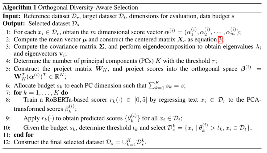 为了解决这一问题,他们提出 ODiS (Orthogonal Diversity-Aware Selection)。首先,对数据进行多维评价,至少包括语言质量 (language quality)、知识/事实质量 (knowledge quality)、语义 / 理解难度 (comprehension difficulty) 等多个维度。然后通过PCA将这些维度 “正交” 化 —— 即将不同维度间的相关性移除,使得不同方面真正成为彼此独立的特征维度。对每个正交维度,训练一个打分器,将该维度上的得分 (PCA 投影得分) 回归到数据上,以便于大规模语料上快速打分。最终构造训练集时,不是只从总体评分最高的数据抽,而是从每个正交维度分别选取 top-scored 的数据 (或按比例抽样),从而保证训练集既覆盖多个维度,又保持多样性 (因为不同维度上 top-scored 的数据往往彼此不同)。 实验证明,用 ODiS 选择的数 据训练出的模型,在多个下游任务上显著优于使用传统 基于打分单一指标的 baseline。作者报告,当维度之间的重叠被有效避免(inter-dimension overlap < 2%)时,模型表现更稳定、更优秀。 这篇论文的贡献在于:挑战“高分 = 好训练数据”的直觉,并展示了为什么为了更好泛化,我们需要在数据选择中更细粒度地分解质量指标,并主动保证多样性,而不是简单地选总分最高的数据。