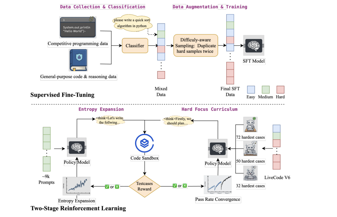 阶段一:用 9 k 均匀难度题、每题 8 rollout,24 k 长度,打破模式坍塌;