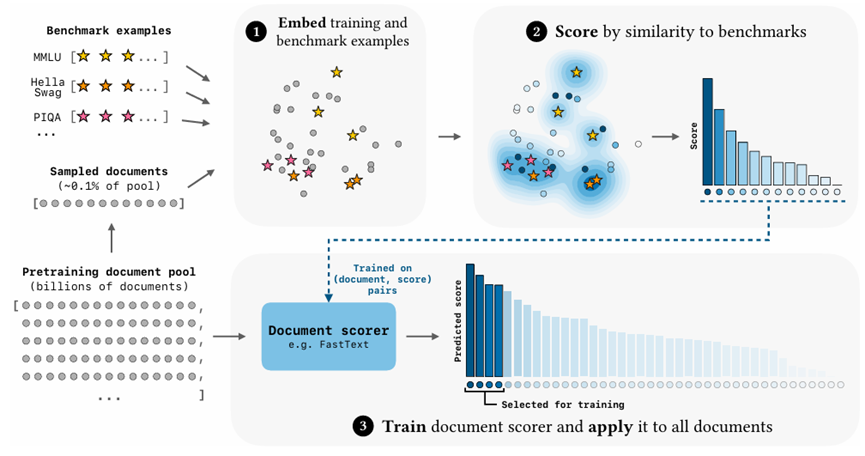 这篇论文系统研究了一个关键问题:预训练语言模型时,如果训练数据的分布与目标任务更为一致,模型性能是否会显著提升。作者提出了一种简单而高效的数据选择方法 BETR(Benchmark-Targeted Ranking)。它的基本思想是:将目标任务的样本与预训练语料的一个子集映射到同一向量空间中,计算相似度排序,再用轻量分类器把这种排序推广到整个大规模语料库。如此就能提取出最符合目标任务分布的预训练数据。