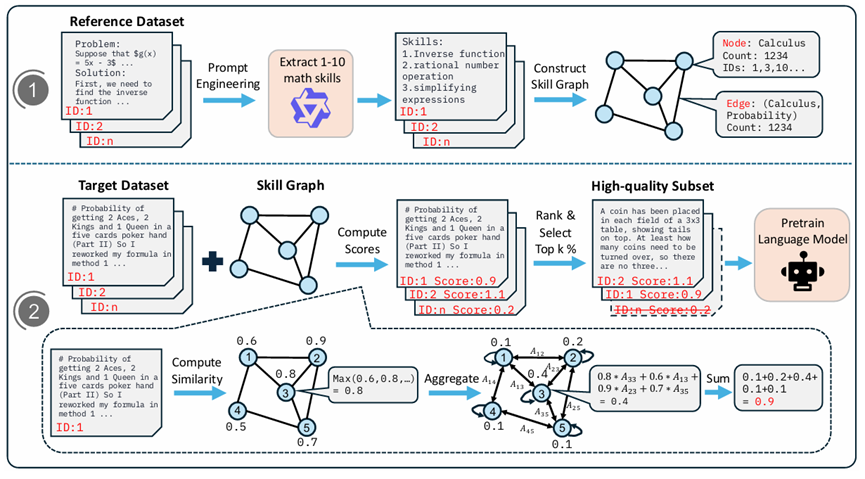 方法首先从高质量数学语料中抽取核心数学技能,例如代数、几何、微积分、证明推理等,并构建其图结构。每个节点代表一种技能,边表示技能之间的依赖。然后,针对候选数学语料,系统分析其涉及的技能组合,并将其映射到技能图中,根据覆盖技能的数量、深度和重要性生成质量分数。最后,根据该分数对数据排序,选出最能提升模型数学能力的数据子集。