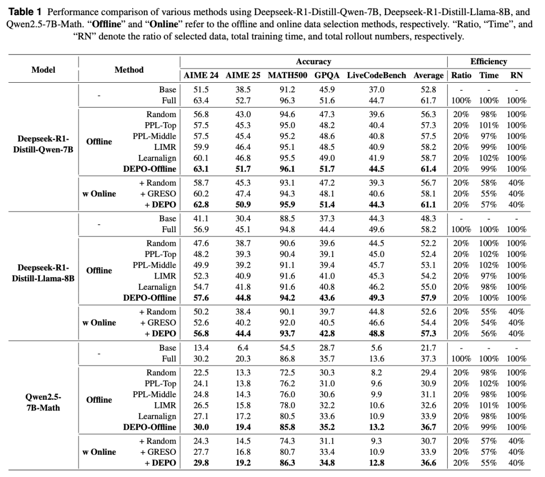 本文在三个模型和五个推理数据集上都进行了详细的实验,实验结果表明 DEPO 在各个数据集上都展现出强大的性能和效率优势。