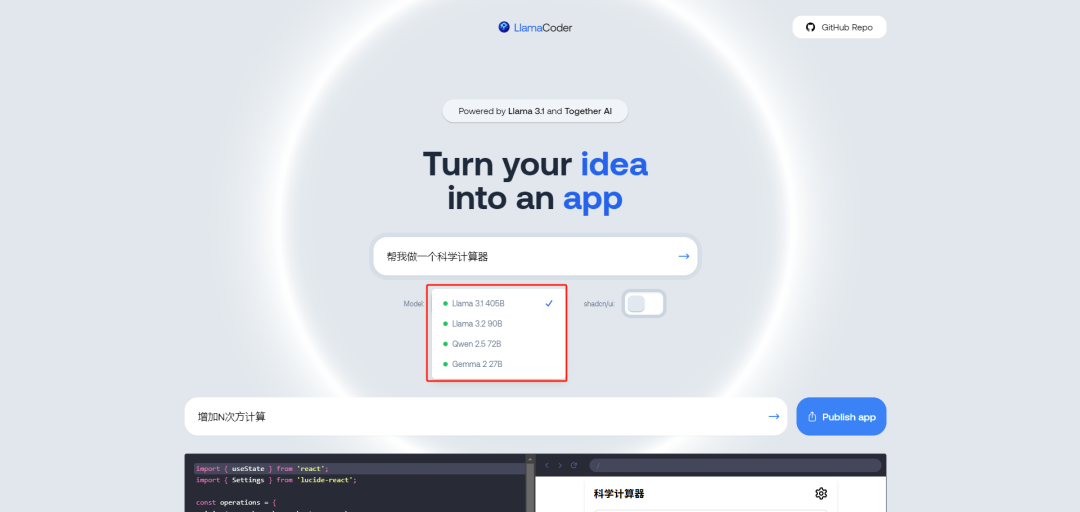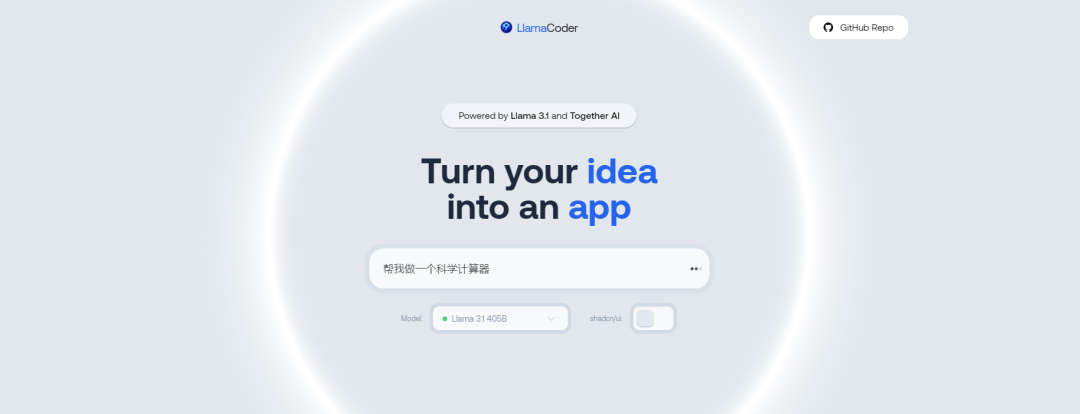 之前给大家推荐过一个基于Claude做的,Llamacoder是用了Meta 的 Llama 3.1 405B 作为底层语言模型。