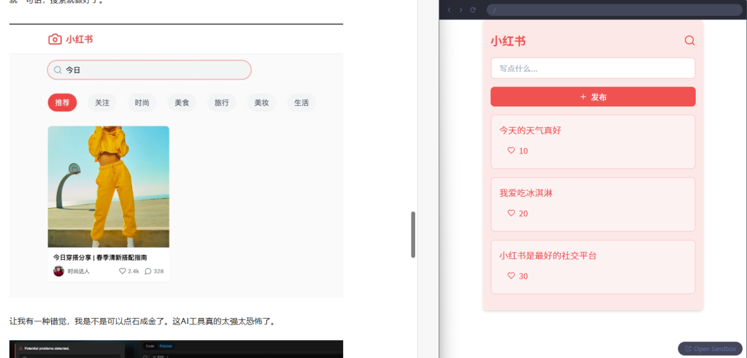 最大的亮点就是,左侧AI写代码,右侧实时渲染。