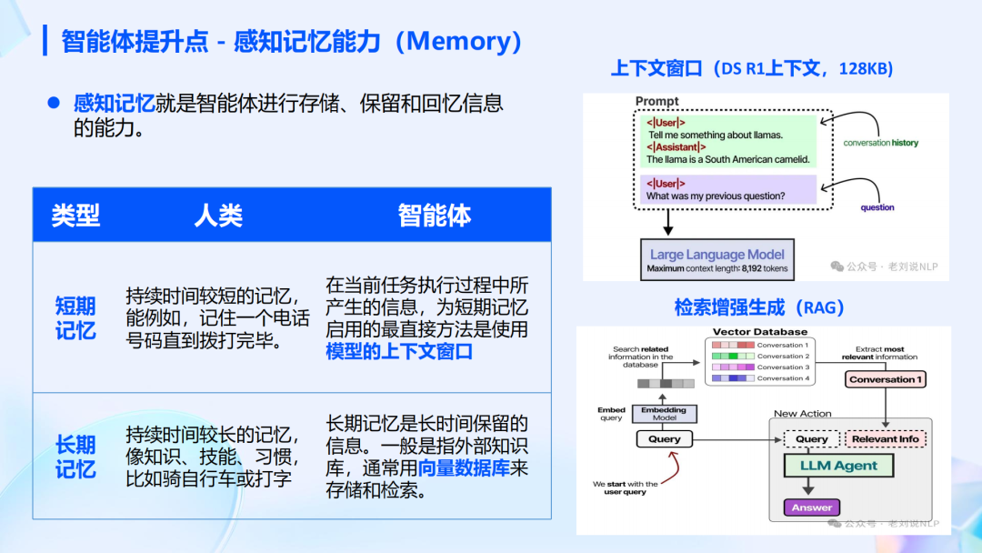 | 长期记忆 | 持续时间较长的记忆,像知识、技能、习惯,比如骑自行车或打字。 | 长期记忆是长时期保留的信息,一般是指外部知识库,通过向量数据库来存储和检索。 |