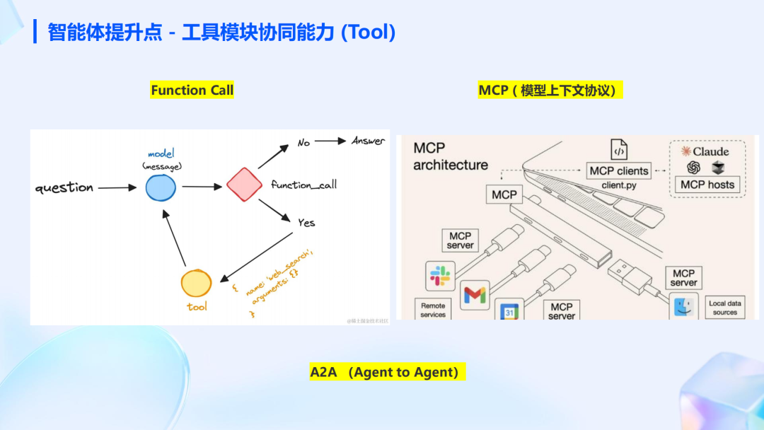 - 生成答案:LLM根据工具返回的结果,结合其自身知识,生成最终的答案。