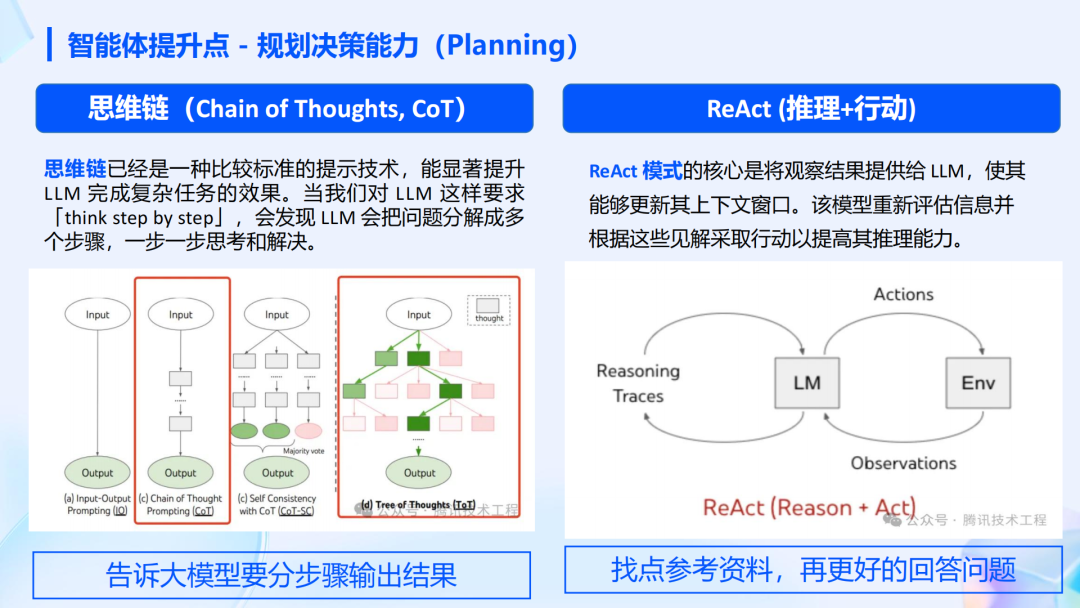 为了赋予AI智能体强大的规划能力,探索了两种核心技术:思维链(CoT)和ReAct(推理+行动)。