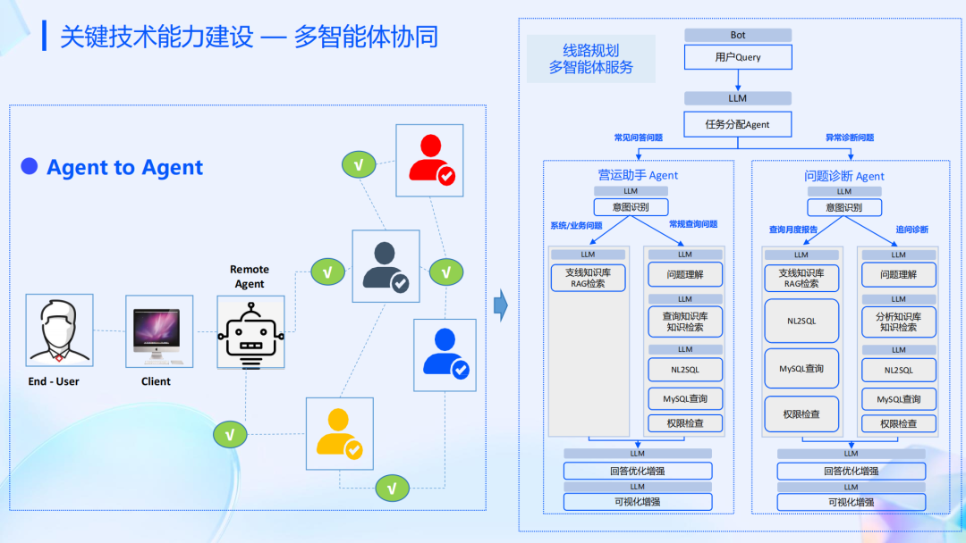 - 多智能体协作:将AI Agent从单兵作战升级为协同作战,多个具备不同专长的小型AI Agent协同工作,共同完成复杂任务。例如,**“运营助手Agent”和“问题诊断Agent”**的协作,实现了从问题识别到解决方案生成的无缝衔接。