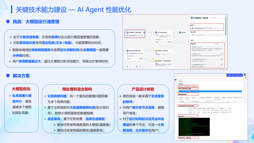 - 执行(运营结果):AI Agent的决策最终转化为具体的运营结果,并与业务系统进行联动,自动完成任务的执行,如航空资源调度和执行。