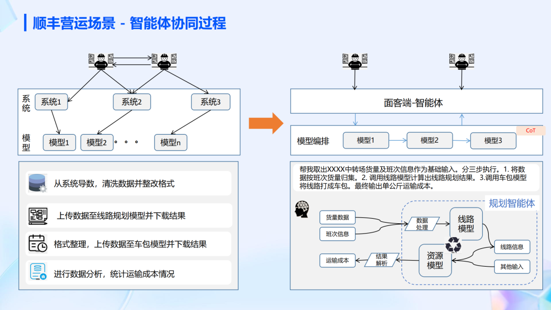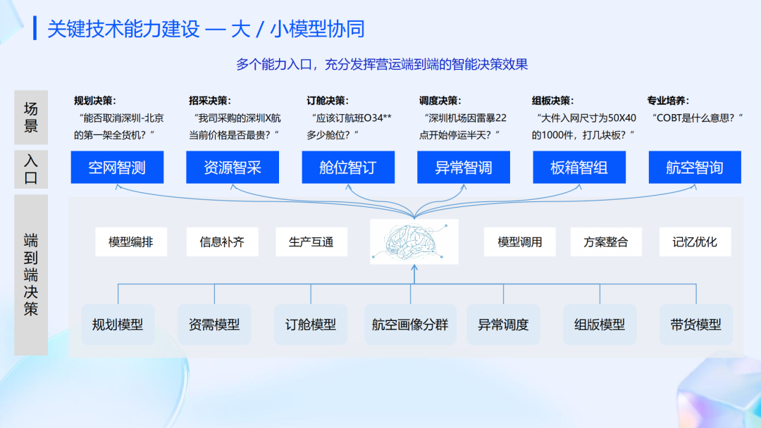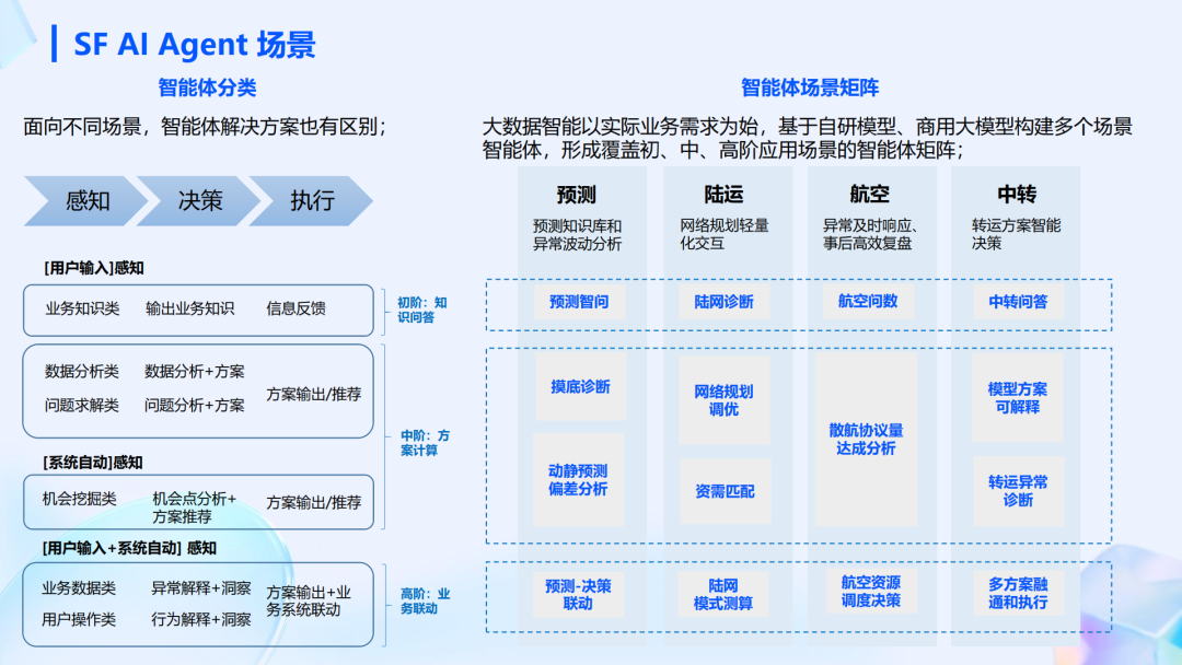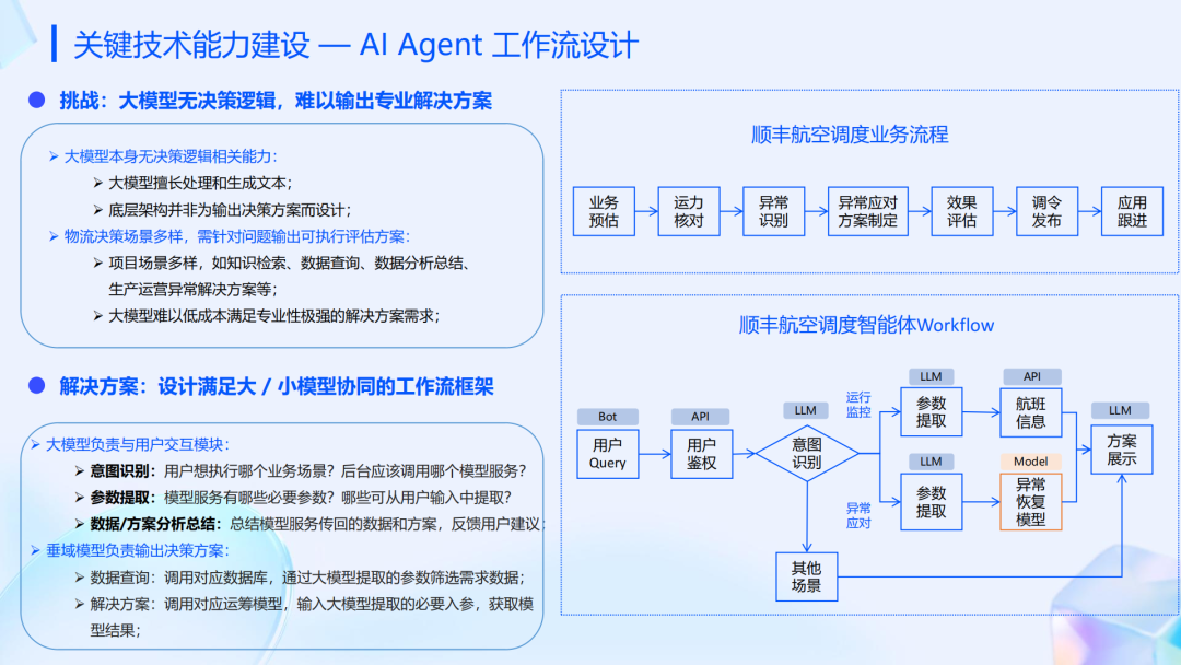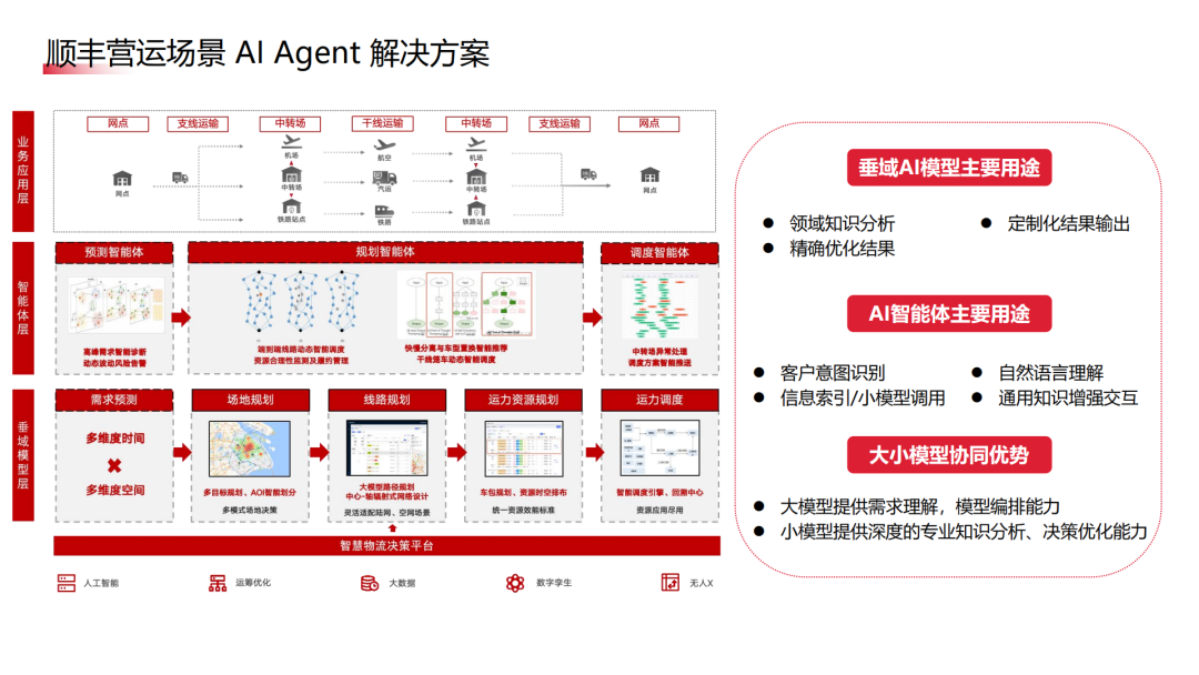 - 垂域基础模型层:这是整个系统的基石,由自研的垂域AI模型和大语言模型(LLM)组成。这些模型负责处理核心的物流任务,如陆运/航空网络规划、资源调度和时效预测。