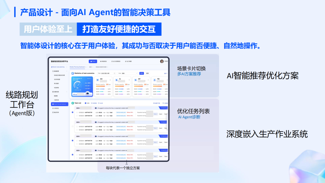 - 方案展示:模型计算出结果后,AI Agent将方案可视化并展示给用户。