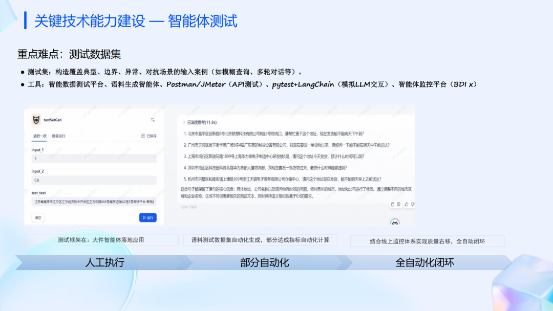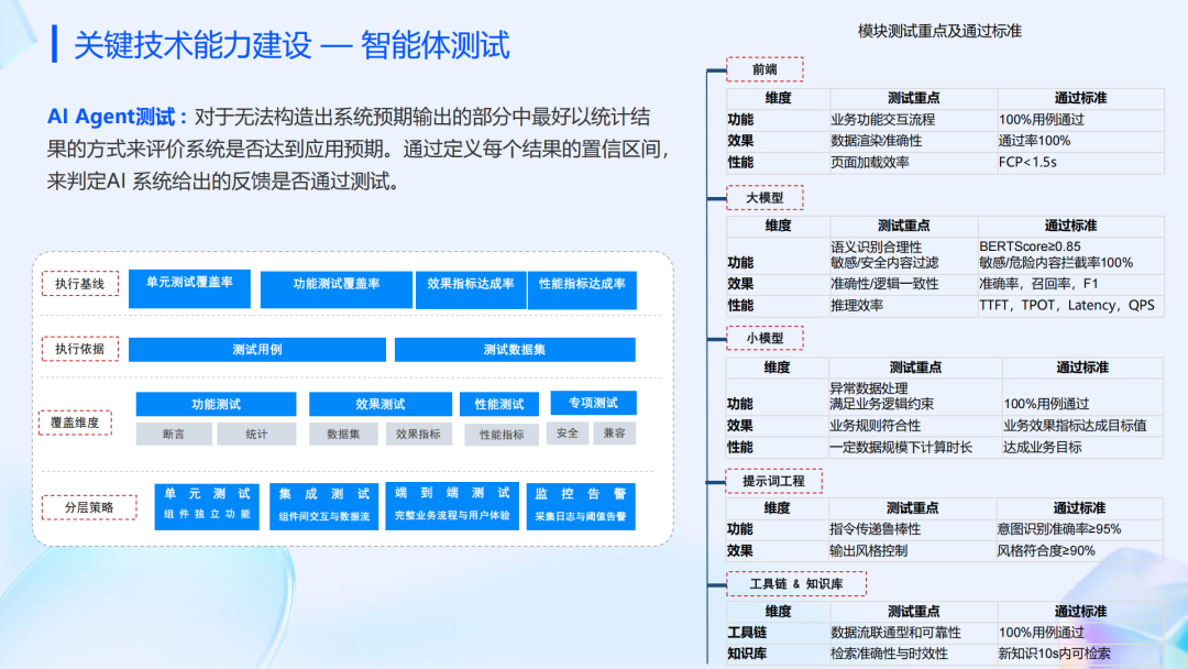 为了保证AI智能体输出的方案在实际应用中可靠,构建了一套完整的智能体测试体系,涵盖从基础性能到业务功能的全面测试。
