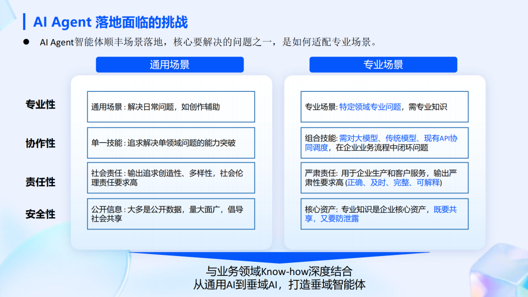 AI Agent的落地面临着从通用AI到垂域AI的挑战,尤其是在数据安全、业务理解和泛化能力方面。应对之道是持续深耕领域知识(Know-how),并构建**“业务-产品-算法”**的闭环,确保AI技术与业务流程的紧密结合。