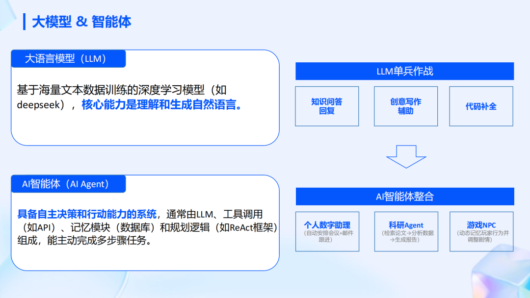 - AI智能体:AI智能体则将LLM的能力进行了集成和扩展。它能够根据任务需求,调用外部工具(如API),利用记忆模块(数据库)存储和调用信息,并基于规划逻辑来分解任务并执行。这使得AI智能体能够完成更复杂的任务,比如个人数字助理、科研Agent或游戏NPC。