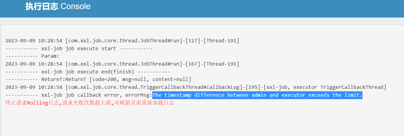 ----------- xxl-job job callback error, errorMsg:The timestamp difference between admin and executor exceeds the limit. 终止请求Rolling日志,请求失败次数超上限,可刷新页面重新加载日志