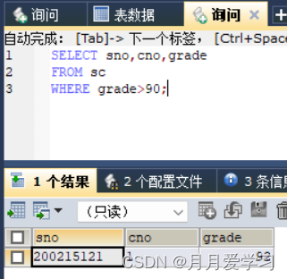 数据库的简单查询——单表查询 本篇文章主要是数据库的一些简单查询,包括条件查询,模糊查询,分组查询等准备工作:三张数据表 学生表(student): 课程表(course): 学生选课表(sc): SQL语句:select * from student;SQL语句:SELECT sname,sno FROM student;检索全体学生的学号、姓名、性别信息,并分别加上“学号”、“姓名”、“性别”的别名信息。