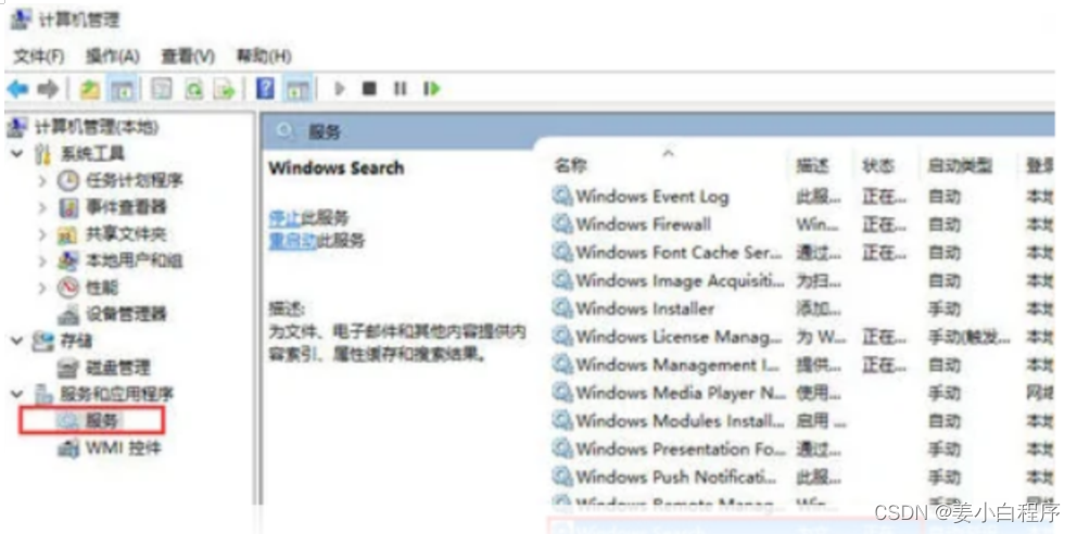 2、进入计算机管理列表菜单,点击左侧服务在显示右侧的服务名称中找到Windows Search选项。