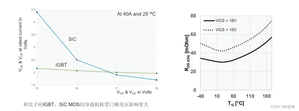 SIC MOS的保护方式 由下面图可看出,MOS的增长曲线是凹函数,而IGBT的增长曲线是凸函数。该方法的缺点在于功率损耗。在大功率系统中,大电流会在分流电阻器上产生较大的功率损耗。在小功率系统中,需要更大的电阻来确保检测信号的准确性,这也会在小功率应用中产生损耗并降低效率。一方面,SiC MOSFET 的转换电压通常非常高,因此无法限制电流。对于 IGBT,去饱和阈值电压通常设置在转换电压附近,因为之后电流几乎可以受到限制,以便 IGBT 能承受更长的时间。例如,几十A的时候,检测电压1V,那么正常工作时带来的功耗将是几十W。