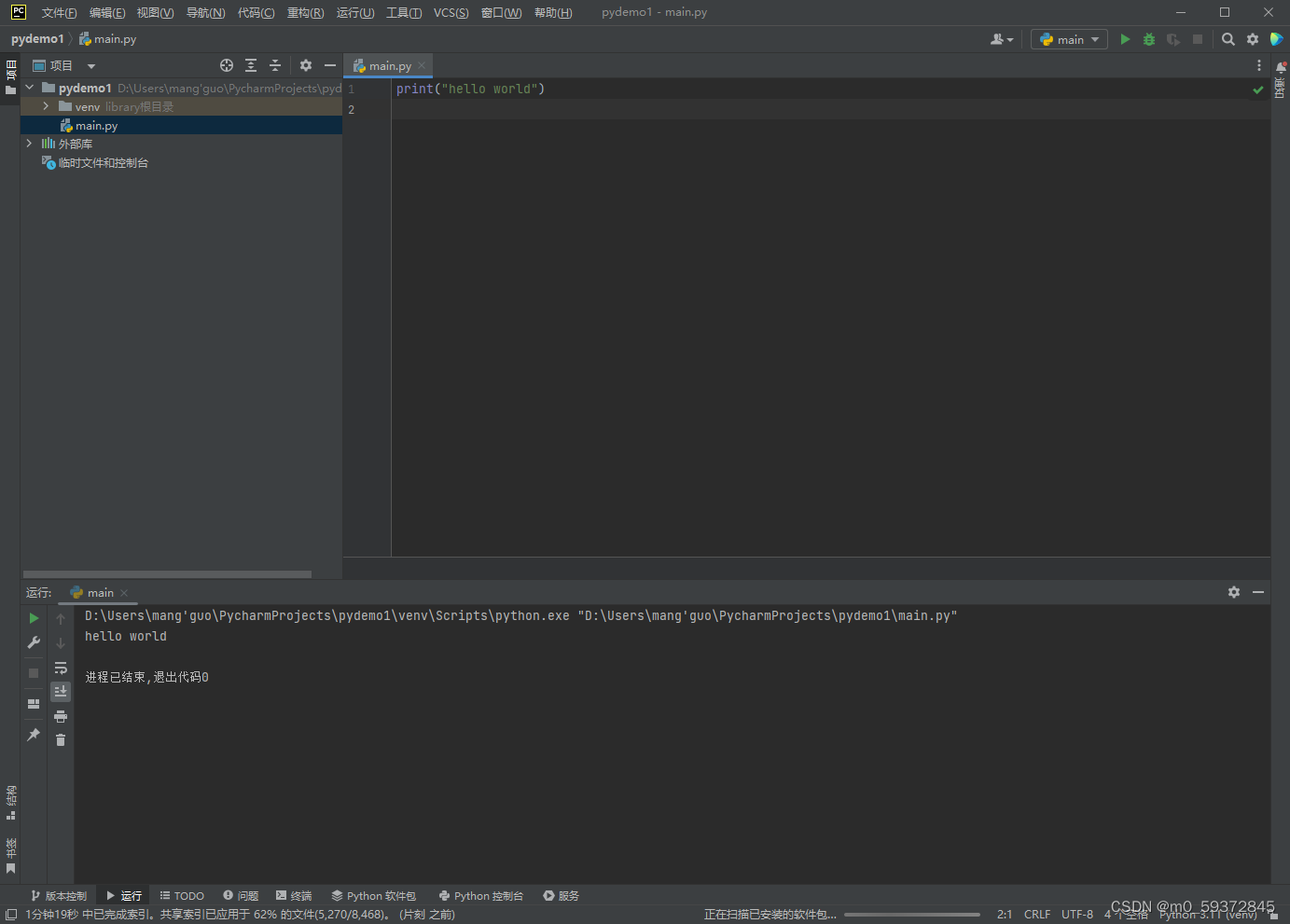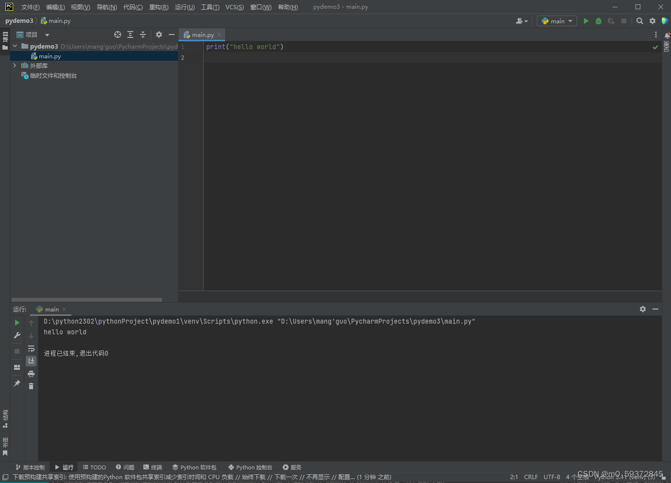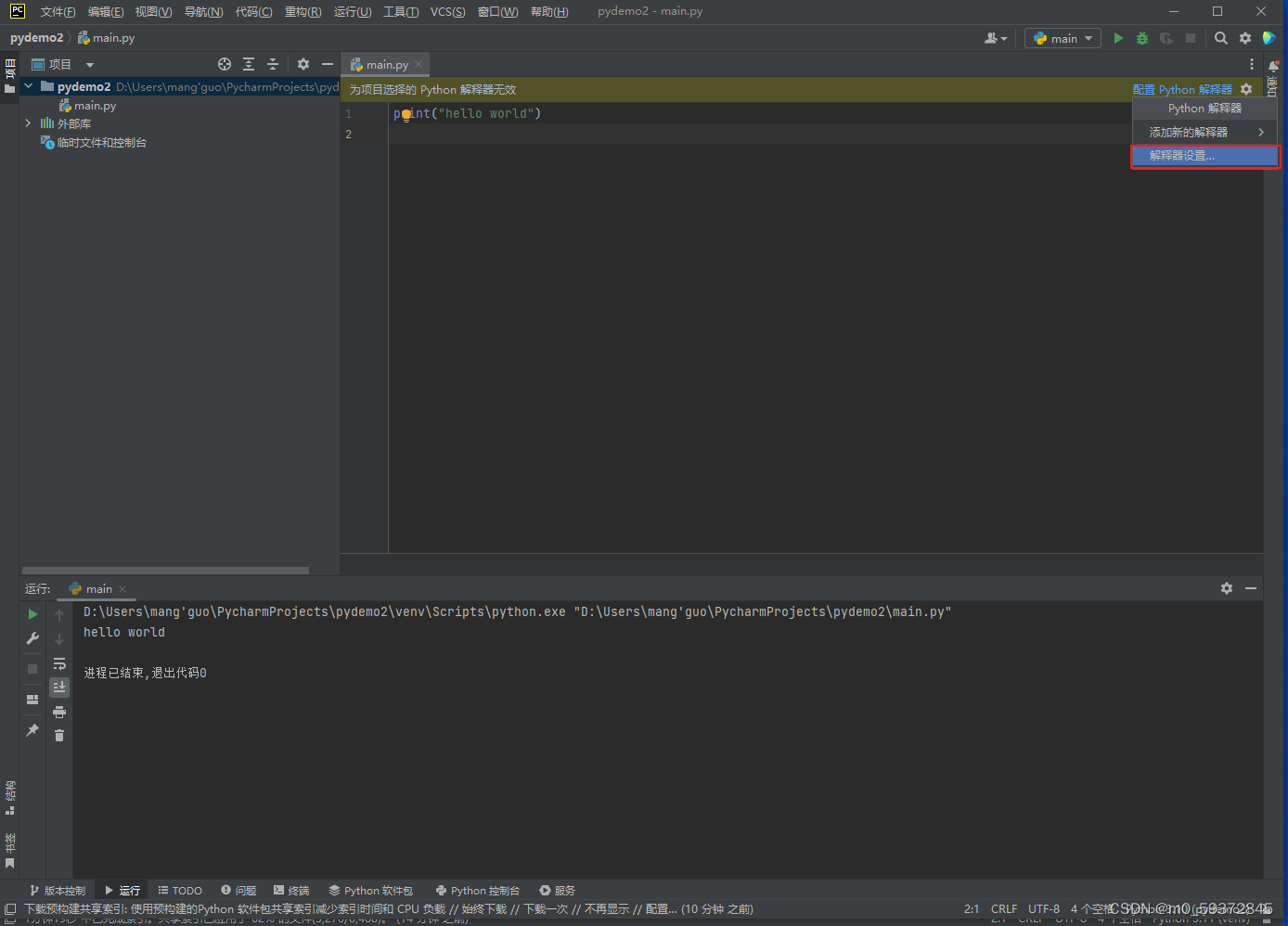 4.删除demo2项目下的venv文件夹,使用demo1的虚拟环境