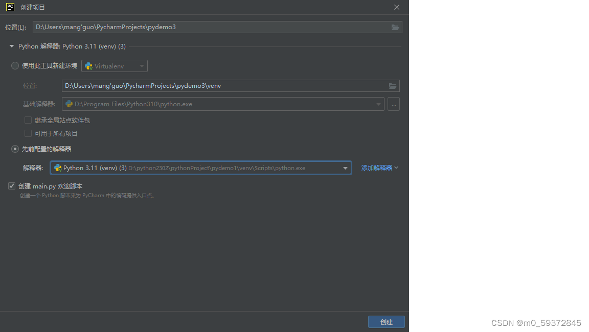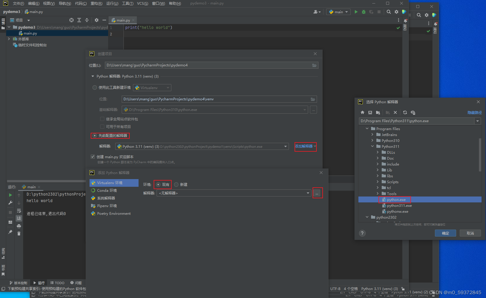 6.新建项目demo4,使用python310真实环境