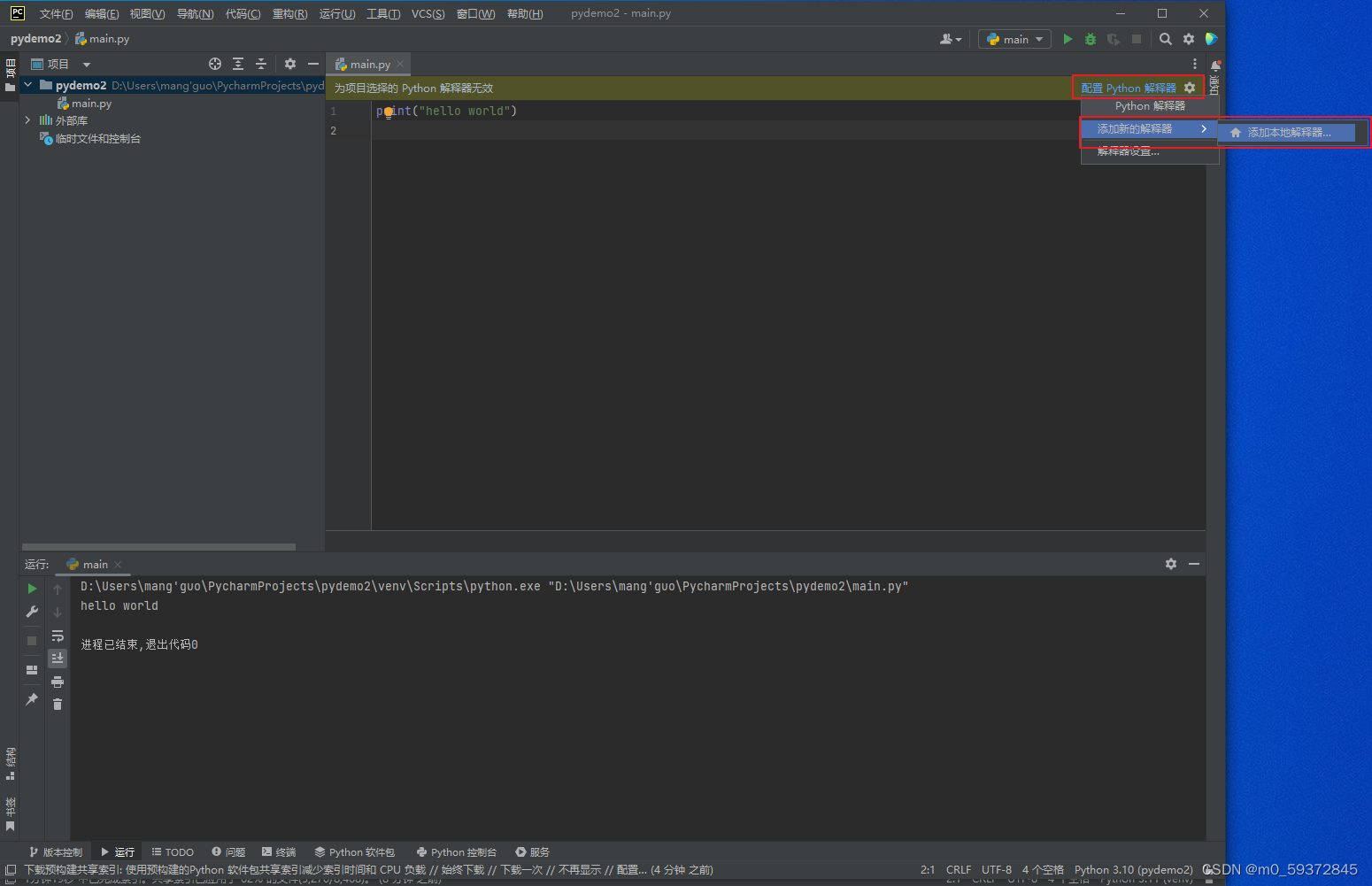 3.删除demo2项目下的venv文件夹,为demo2添加新的虚拟环境