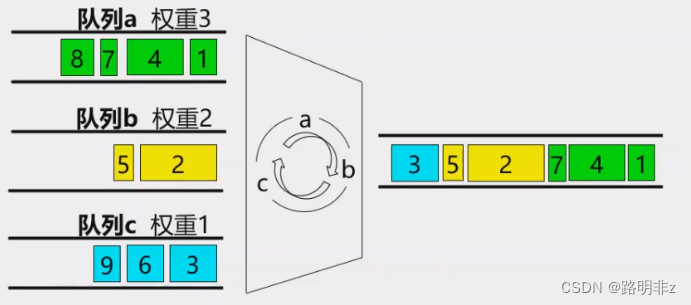 根据每个队列的权重来轮流调度各队列中的报文流,实际上,RR调度相当于权值为1的WRR调度