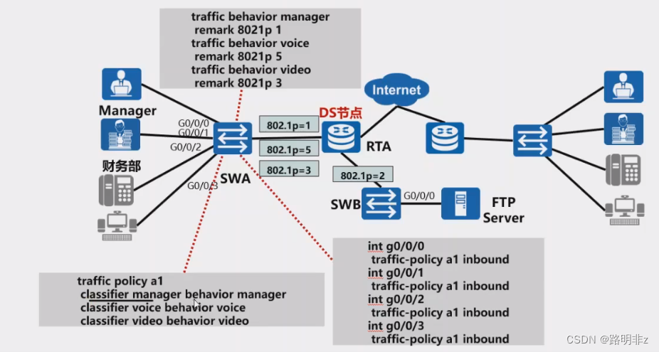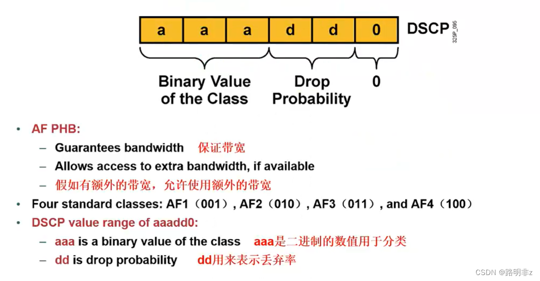 AF 确保转发服务 : 实现带宽保证的业务,AFxy ,X(取值1-4)代表优先级,越大优先级越高,