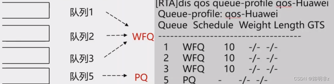 配置:命令效果:将5号队列设置成PQ,将1,2,3号队列设置成WFQ调度方式,并在G0/0/0口调度该队列方式
