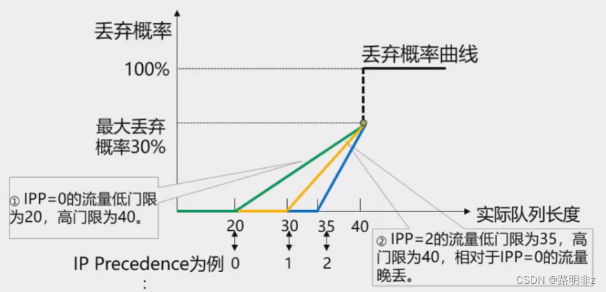 当队列在20-30之间我随机丢弃IP优先级为0的,当队列在30-35之间我随机丢弃IP优先级为1的,以此类推