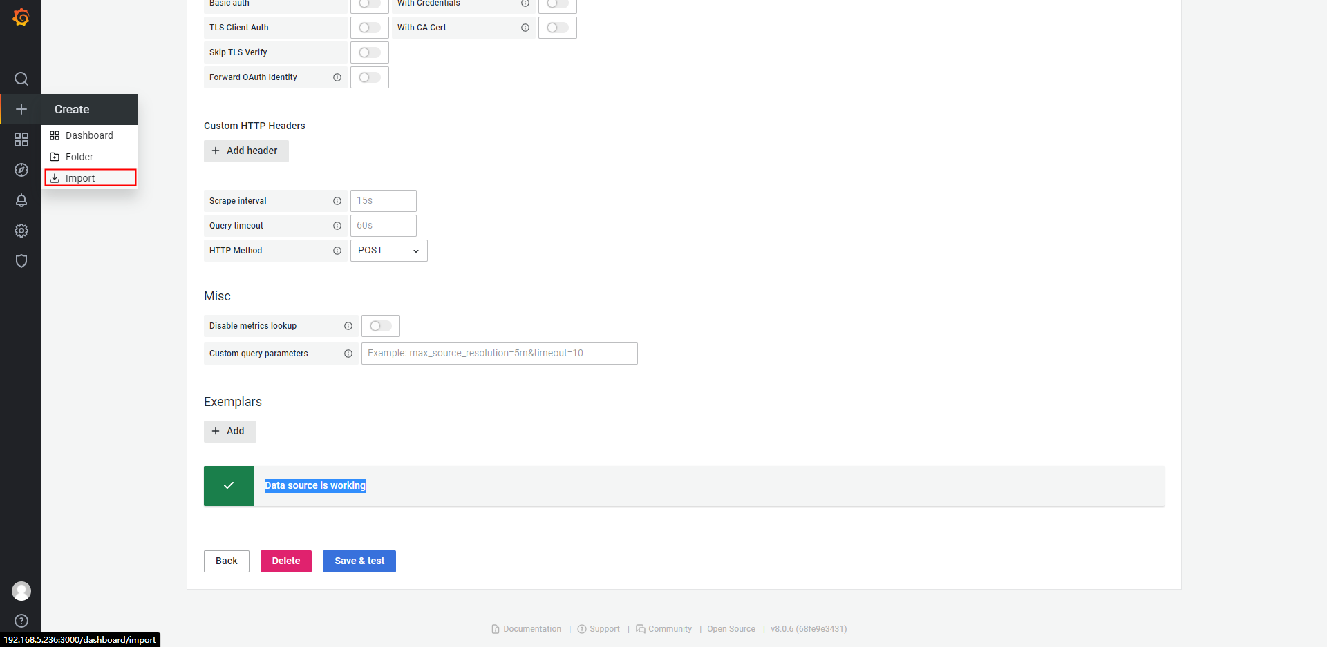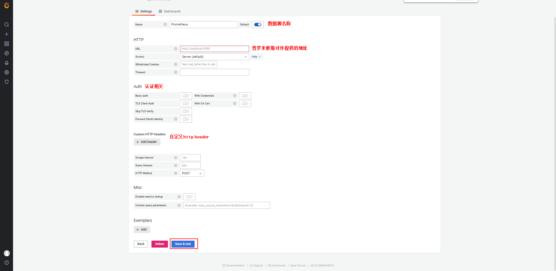 新建数据源,并选择prometheus源